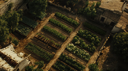 Vegetable plants thrive in neat rows within a lush garden, showing the beauty of sustainable agriculture in a rural setting.