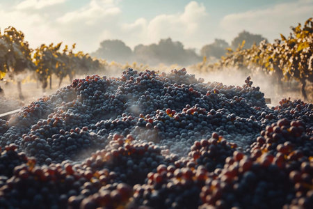 A blanket of ripe grapes lies on the ground, bathed in morning light. Surrounding vines glisten with dew, creating a serene atmosphere in the vineyard's tranquil setting.