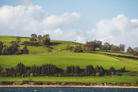 Green hills near Firth of Clyde river, panoramic view from a sailing boat. Dramatic sky after the storm. Scotland, UK. Travel destinations, eco tourism, vacations, pure nature. Atmospheric landscape