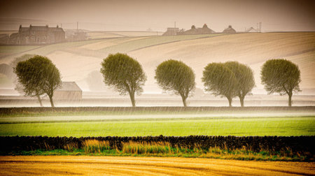A picturesque and atmospheric view of five trees standing in a line across a misty green field. Rolling hills and distant farmhouses create a classic bucolic landscape.