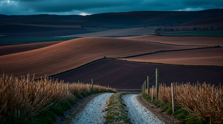 Gravel road descends through colorful, rolling farmlands at dusk, creating a serene countryside view. Ai generated image