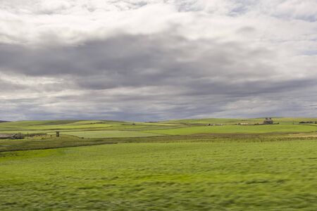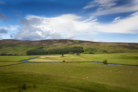 Sunny landscape with fields and blue sky in Scotland