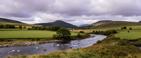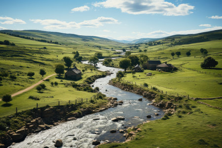 a river flows through a lush green grassy valley, showcasing the traditional british landscape in a style reminiscent of light sky-blue and light amber hues. captured with the zeiss milvus 25mm f/1.4 ze lens, this photo exudes the essence of prairiecore aesthetics, with atmospheric light and shadow creating a stylish celebration of rural life. ai generated