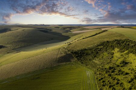 Beautiful drone landscape image of English countryside during late afternoon sunset Summer light