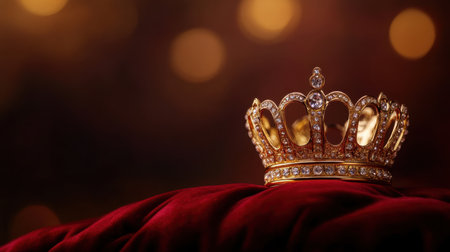 Symbol of royal authority and honor: a golden crown resting on a velvet pillow. Concept Royal Authority, Golden Crown, Honor, Velvet Pillow, Symbol