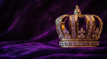A stunning golden crown crowned with sparkling jewels rests on a rich purple velvet backdrop, exuding an air of royalty and luxury, perfect for elegant themes.
