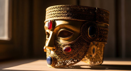 A close-up of an ancient golden mask featuring intricate filigree metalwork and embedded red and blue gemstones. The artifact is illuminated by dramatic lighting, highlighting the craftsmanship and historical significance.