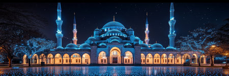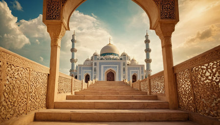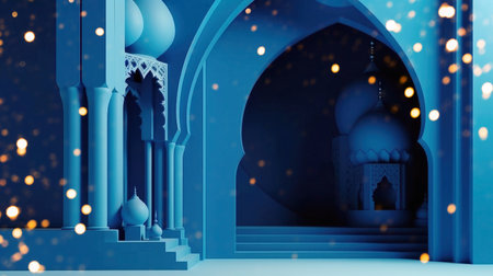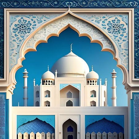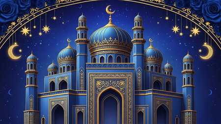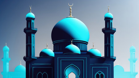 Artistic depiction of a blue mosque featuring large domes and tall minarets, set against a gradient sky. The design emphasizes symmetry and Islamic architecture.
