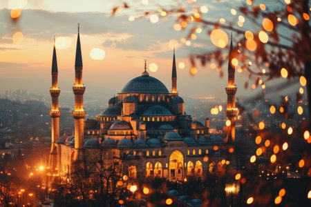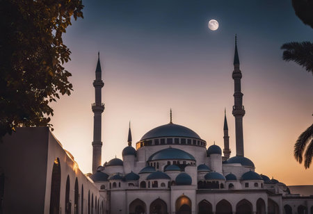 Beautiful mosque illuminated at sunset, symbolizing faith and devotion during Ramadan
