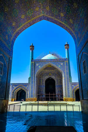 Arches of Historic buildings with persian blue tiles on the wall of Shah Mosque, situated on the south side of Naqsh-e Jahan Square, an important historical site.