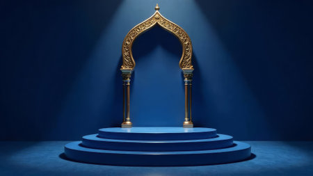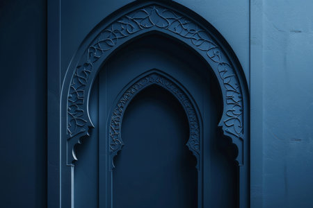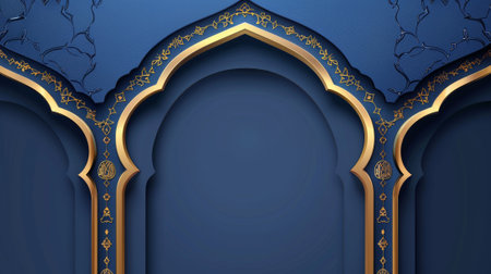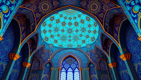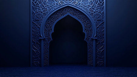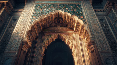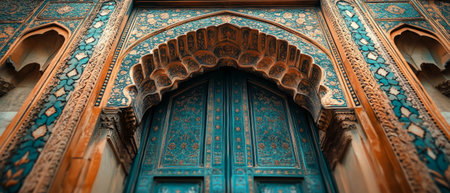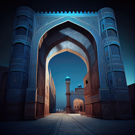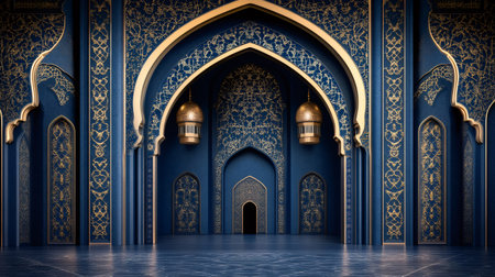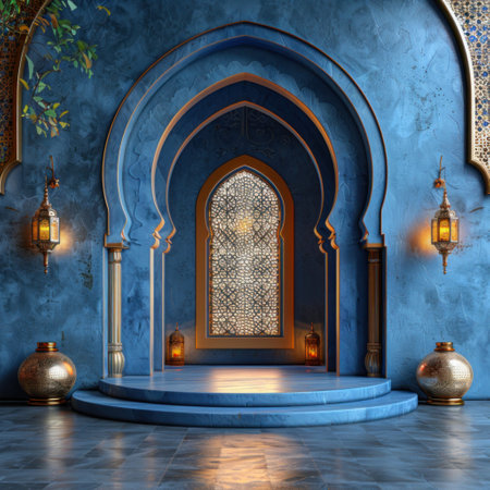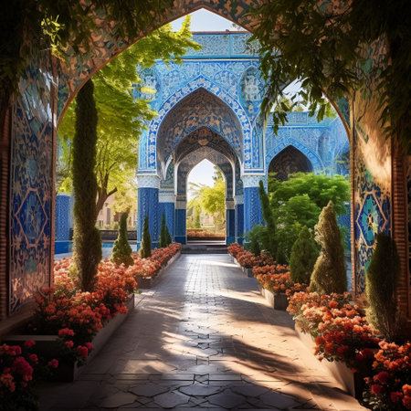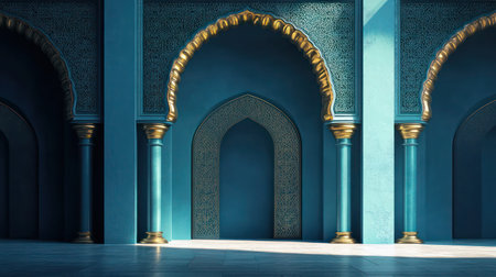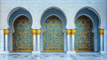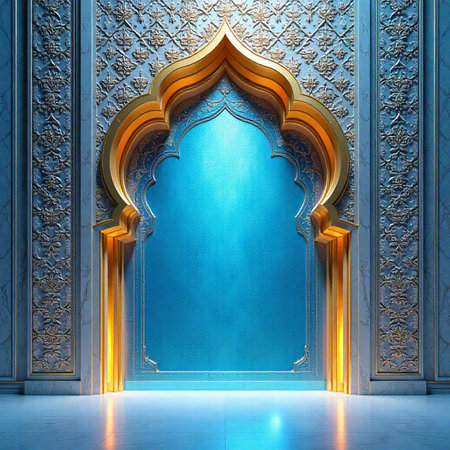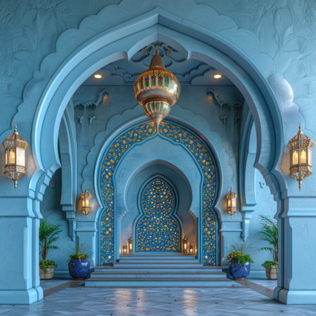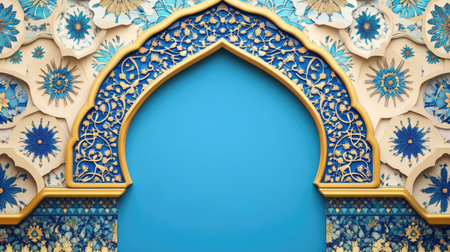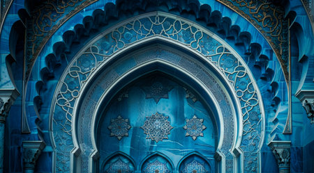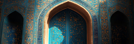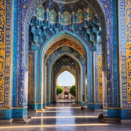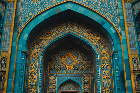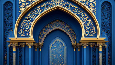 This image showcases intricate Islamic architecture featuring ornate arches with vibrant blue and gold patterns, capturing beauty and cultural significance.