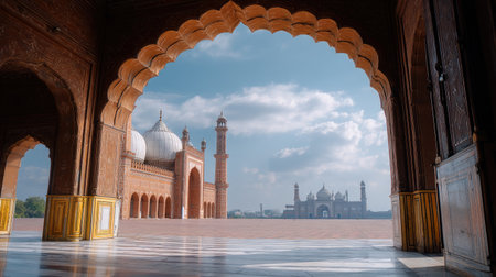 The intricate patterns of a South Asian mosque with a clear sky above, perfect for spiritual content.