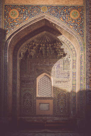 Color image with a madrasa detail in Bukhara, Uzbekistan.