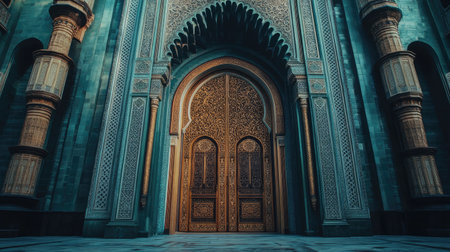 A grand mosque entrance with elaborately carved wooden doors and ornate arches.
