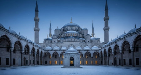 Majestic Blue Mosque showcased in winter snowscape, embodying historical architecture iconic landmark, breathtaking sight serene ambience.
