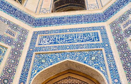 The tiled decorations over the entrance to the Mir-i Arab Madrassah, Bukhara, Uzvekistan.