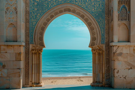 Generative AI Image of Islamic Ornament Frame of Entrance Gate with Beach View in Summer
