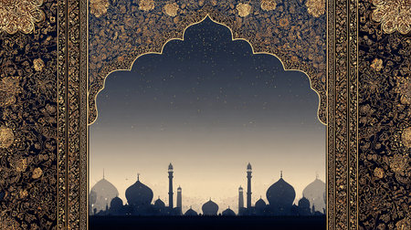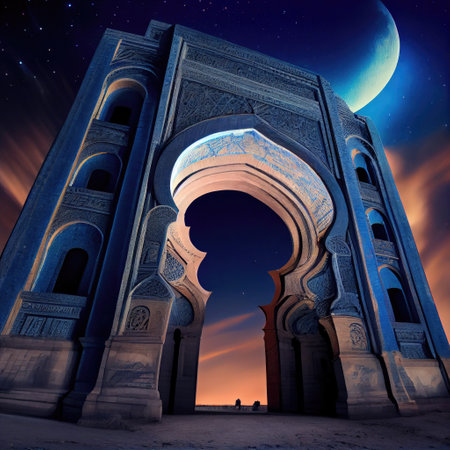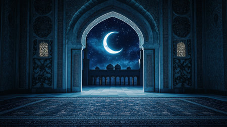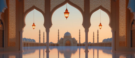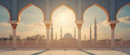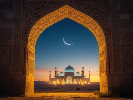 A serene image of a mosque at sunset, viewed through an intricately designed archway. The mosque features domes and minarets, with a crescent moon visible in the sky. The architecture is highlighted by detailed carvings and patterns on the archway, creating a peaceful and spiritual atmosphere.