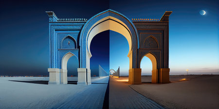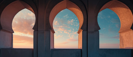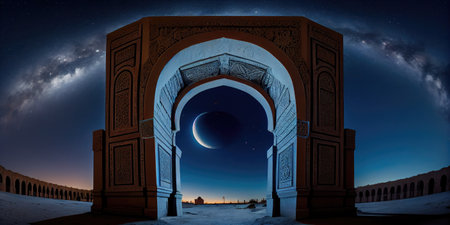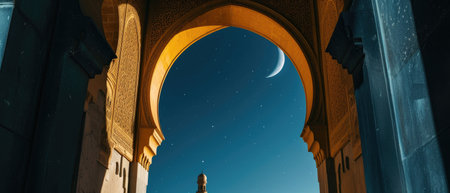 A close-up view of elegant Arabian arches against a clear night sky. Ramadan Kareem background with mosque arch. Islamic greeting Eid Mubarak cards for Muslim Holidays festival celebration.