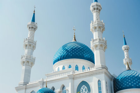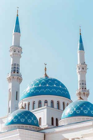 Modern blue mosque with intricate details and towering minarets, showcasing the harmonious blend of tradition and progress in a contemporary cityscape