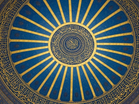 A stunning blue and gold dome with intricate Arabic calligraphy design
