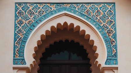 Decorative arch with unique tilework on building entrance, ample copy space.