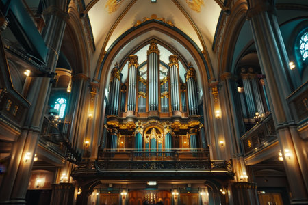 Majestic Church Interior with Magnificent Pipe Organ and Wooden Pews Concept of Spiritual Serenity, Architectural Grandeur, Sacred Spaces, and Historic Design.