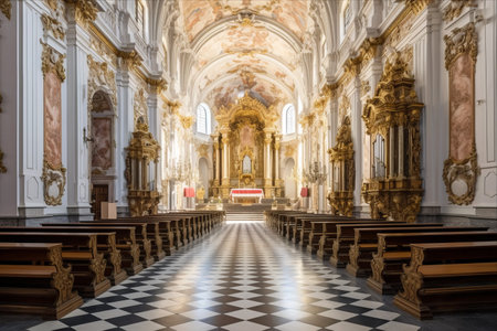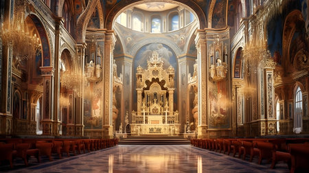 Stunning interior view of a grand church featuring ornate architecture, detailed gold accents, and serene ambiance, ideal for religious and cultural themes.