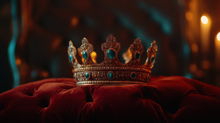 Majestic golden crown adorned with jewels rests on a red velvet cushion