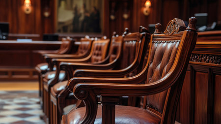 Discover the serene atmosphere of an empty courtroom, featuring elegant wooden benches and intricate architectural details, perfect for conveying themes of justice and authority.