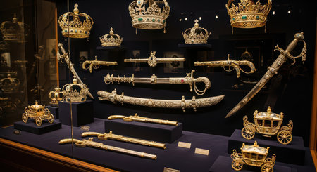 Exquisite collection of ornate golden crowns and swords displayed in museum exhibit