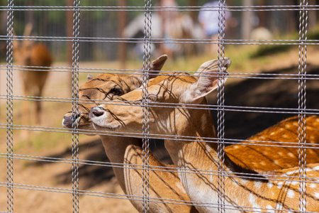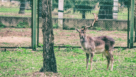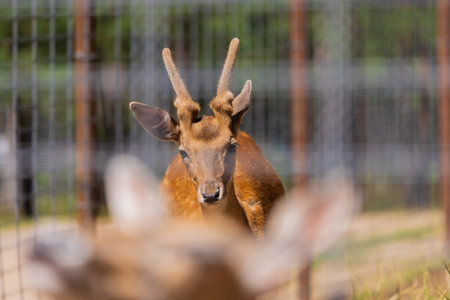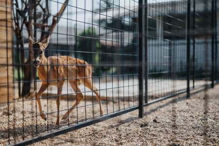 A young deer in the zoos aviary. Wildlife in limited conditions.