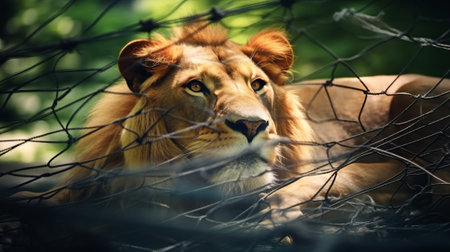 A carnivorous Felidae, with whiskers and a snout, is lounging in a cage with a barbed wire fence. It gazes at a fawn through the grass
