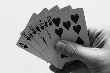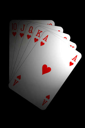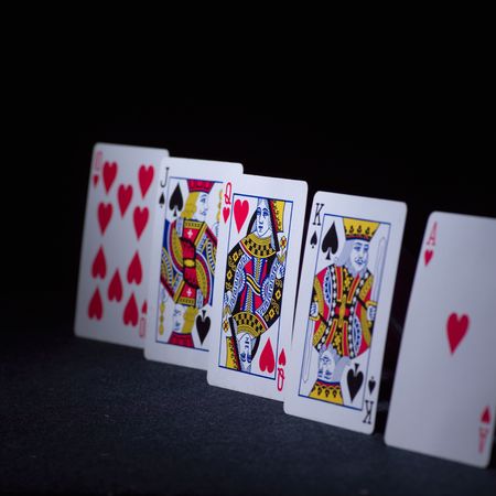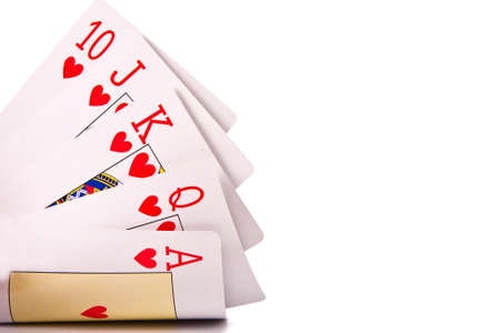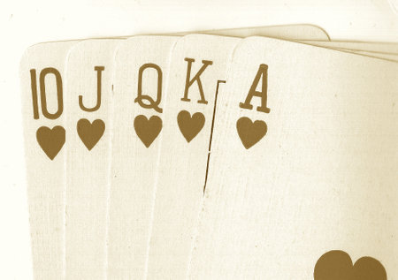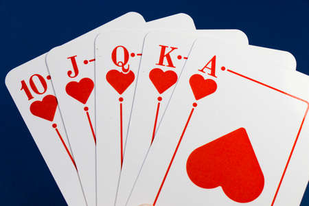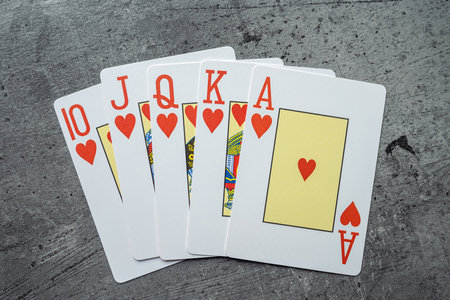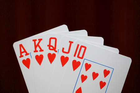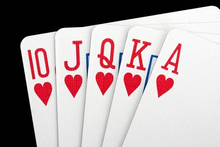 Closeup of heart royal flush the highest ranking hand in hold'em poker in horizontal view