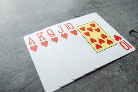 Set of Heart Royal flush playing cards on grey desk. Gambling concept
