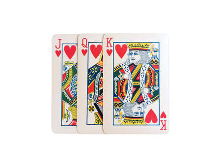CHIANGMAI, THAILAND - NOVEMBER 7, 2018: Three cards of heart set of Jack, Queen, King card arrange overlap isolated on white background.