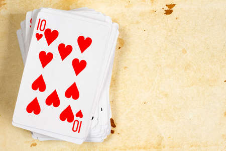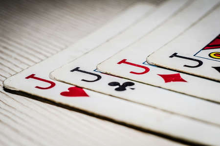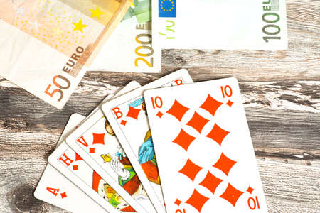 Playing cards close up, isolated on wooden table. Casino concept, risk, chance, good luck or gambling.