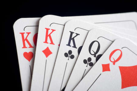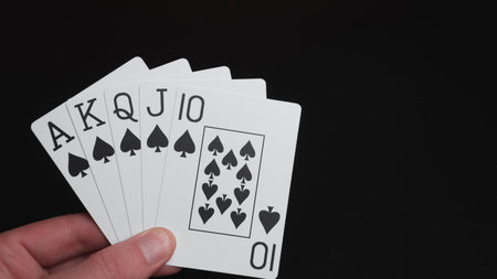 royal flush poker hands on a black background, playing cards, copyspace for you marketing text horizontal photo