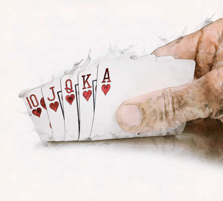 Royal State Flush Playing Card. Player Opening a Poker Card. Closeup and Dark Tone