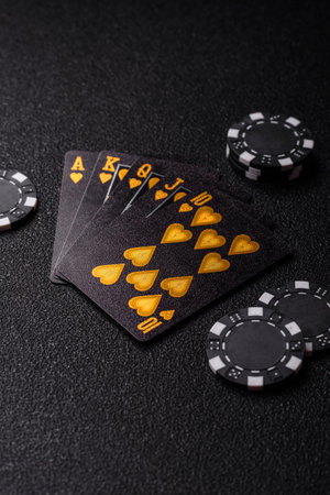 Poker game with Royal Flush combination. Chips and cards on the black table. It's a big win at poker
