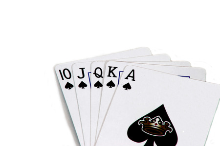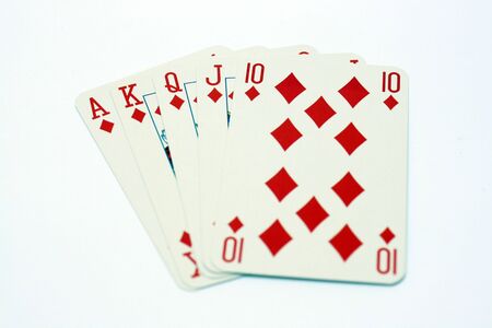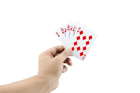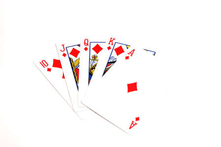 Closeup photos that focuses on the royal straight flush of diamond in the hand on white background
