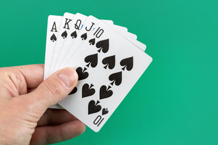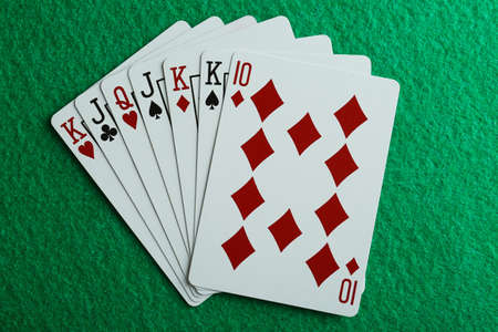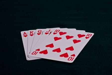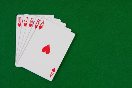 Royal Flush poker card sequence on a green table. Risky entertainment of gambling