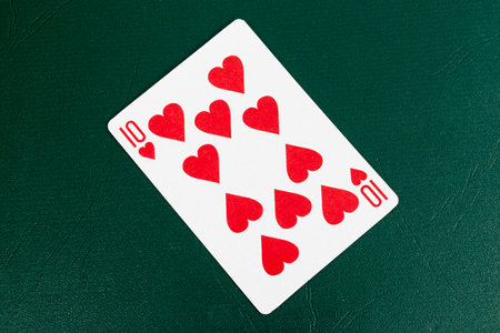 A royal flush of hearts serves as the victorious poker hand on a table covered in green felt