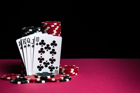 Poker cards with a royal flush combination. Close-up of playing cards and chips in casino. Free advertising space