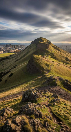 A serene landscape of a green hill with a city in the distance under a cloudy sky