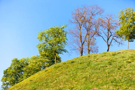Trees are standing on a fresh green field. Nobody, idyllic landscape scenery