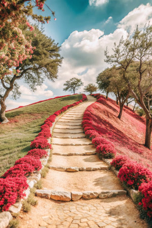 Stone path in the park with red flowers, vintage color tone.