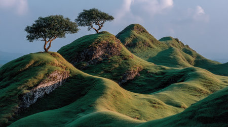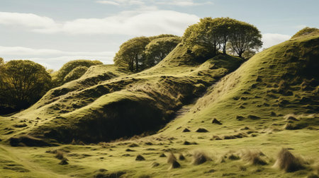 the rolling hills of denmark are majestically captured in this breathtaking thicket photograph, showcasing the country's picturesque landscape under perfect lighting conditions, expertly shot by a professional photographer to evoke a sense of serenity and tranquility in the viewer. ai generated