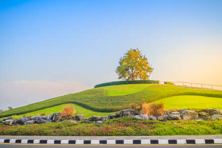 Beautiful landscape view of a Single Golden shower tree (Cassia fistula) on the small hill with green grass and ornamental stones. Golden shower, purging cassia, Indian laburnum, or pudding-pipe tree.