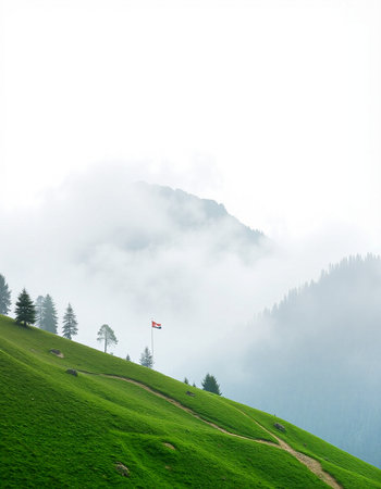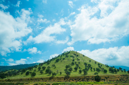 A scenic hill with a bright, clear sky backdrop, showcasing lush greenery under vibrant, sunny clouds